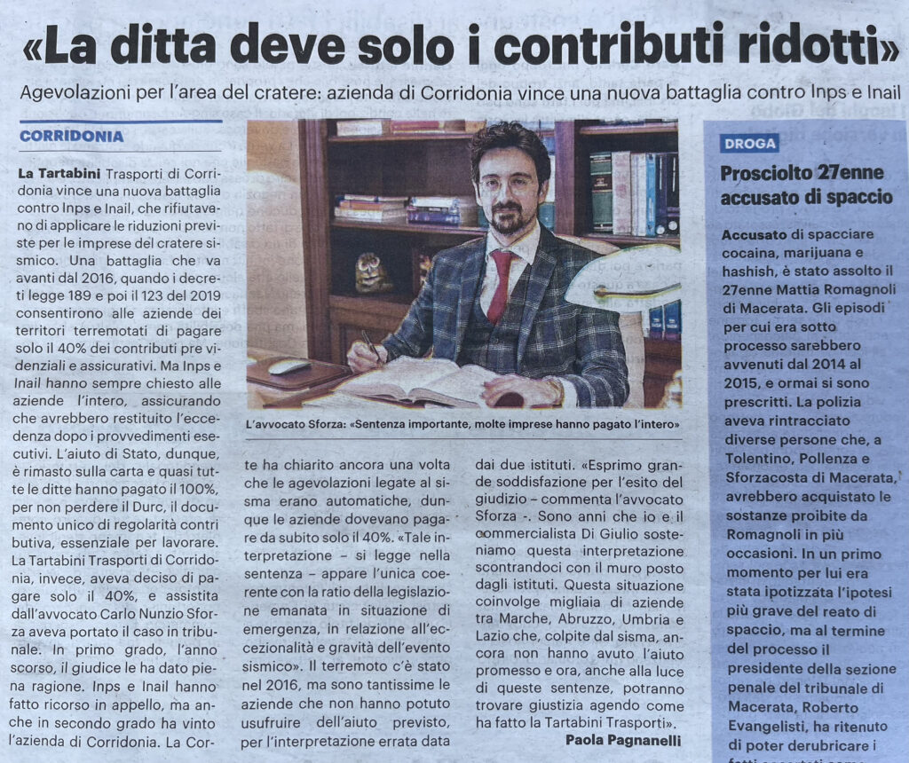 Respinti gli Appelli di INPS ed INAIL contro la Tartabini Trasporti difesa dall’Avv. Sforza: le Aziende ricadenti nel Cratere Sismico 2016 devono i contributi nella misura del 40% e non del 100%.